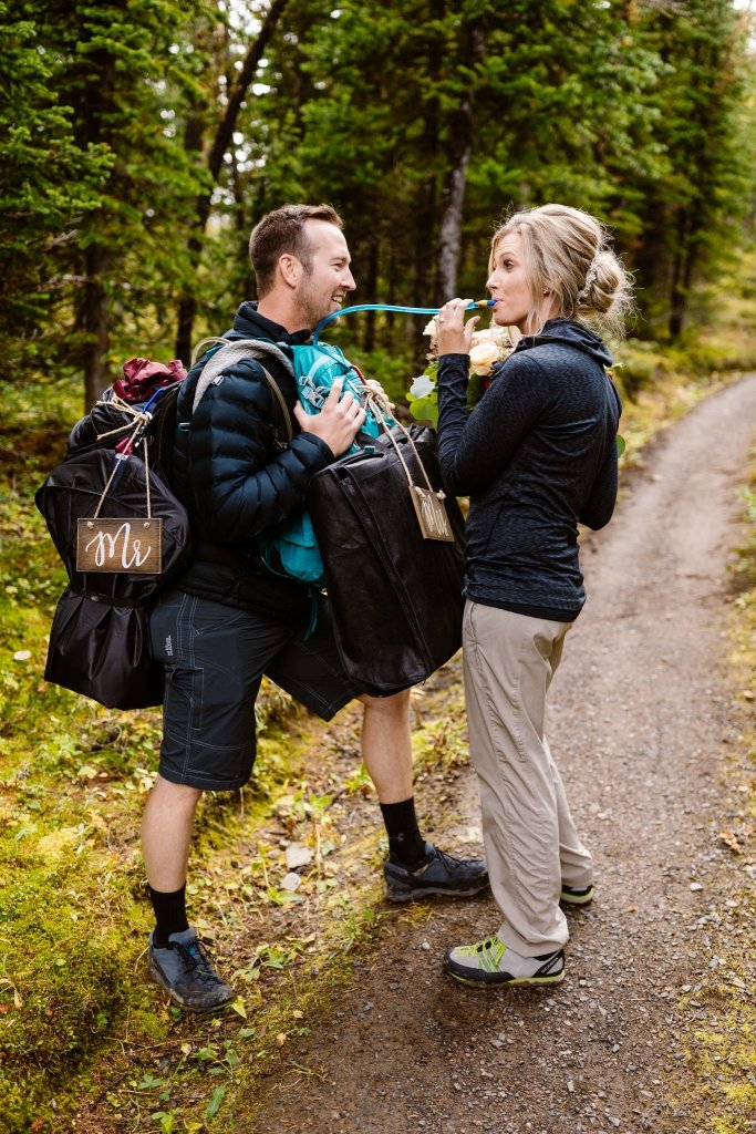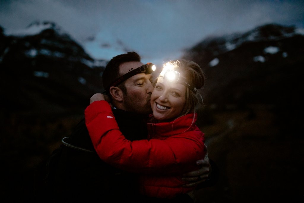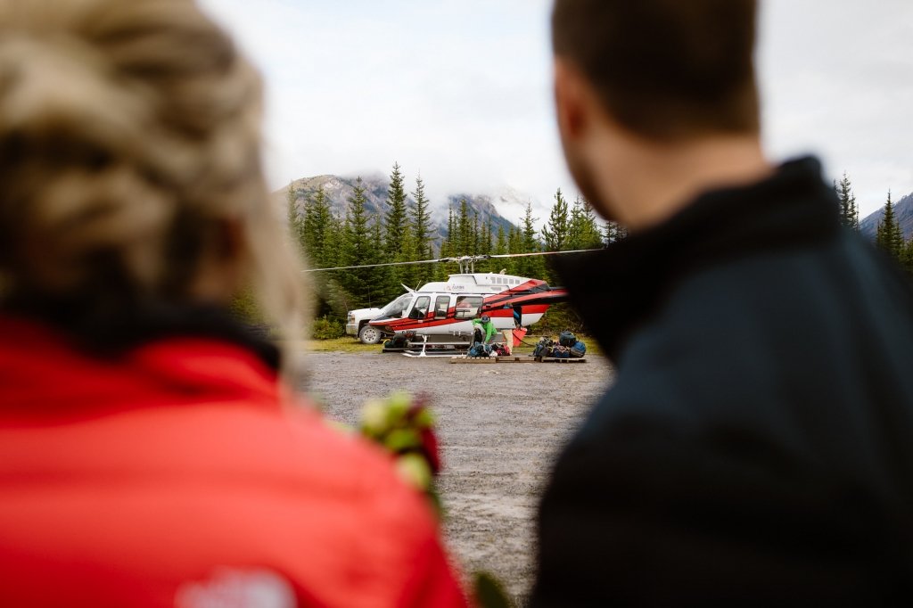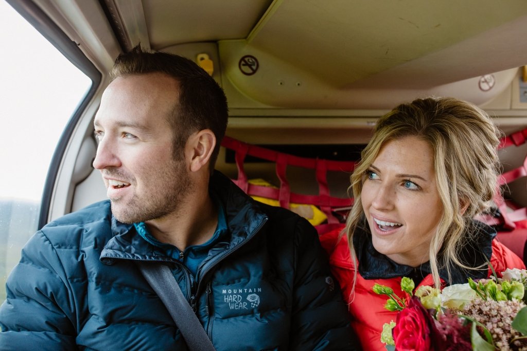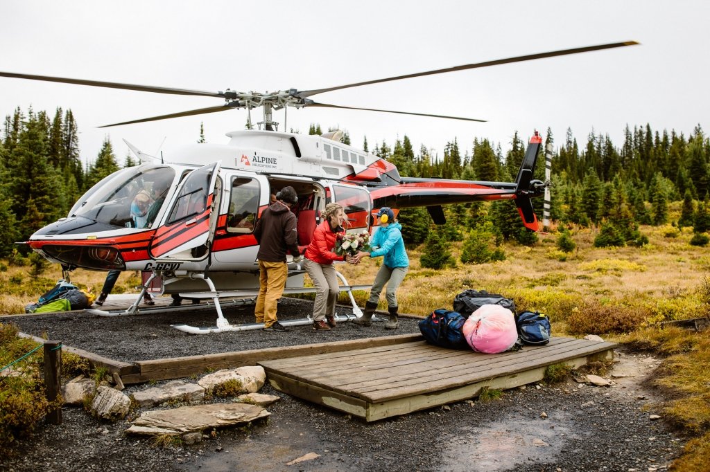 This couple took a helicopter to the base of the lodge, originally built in 1928. There, the two got ready and hiked to a picturesque viewpoint overlooking Mt. Assiniboine, Sunburst Peak, and Cerulean Lake.