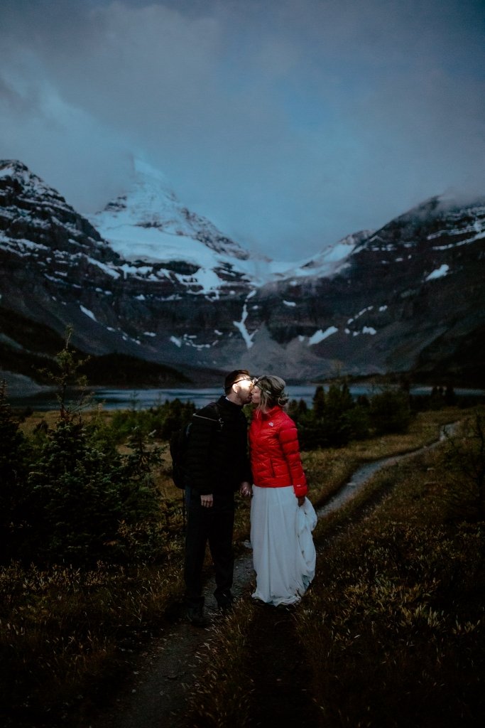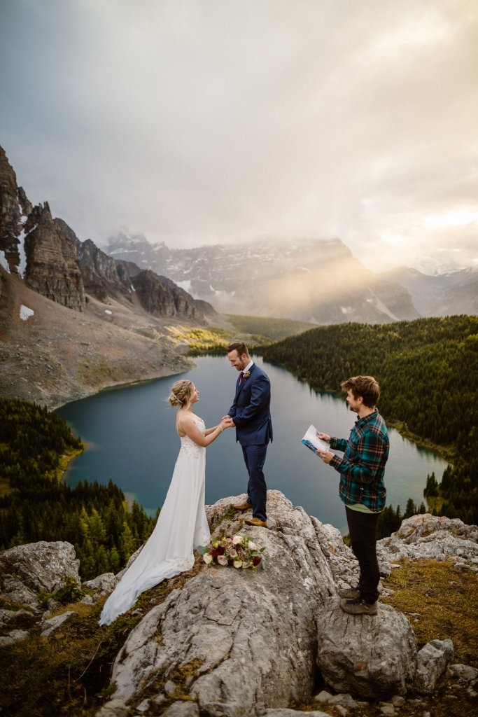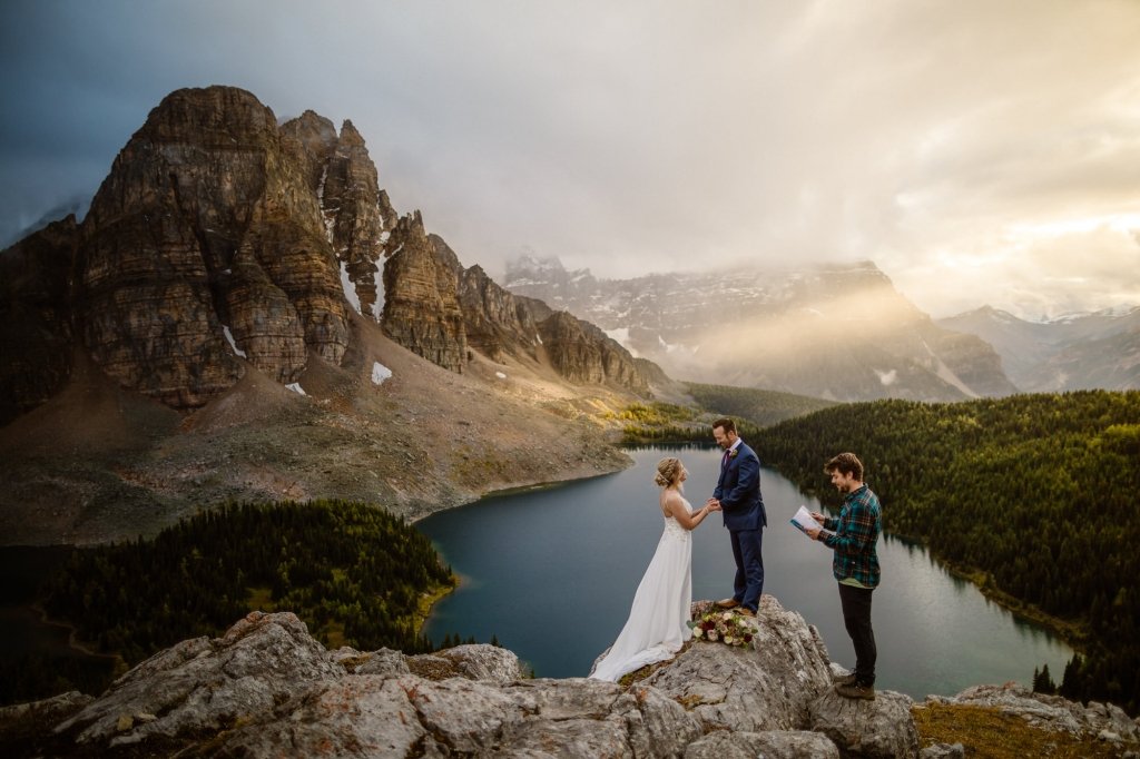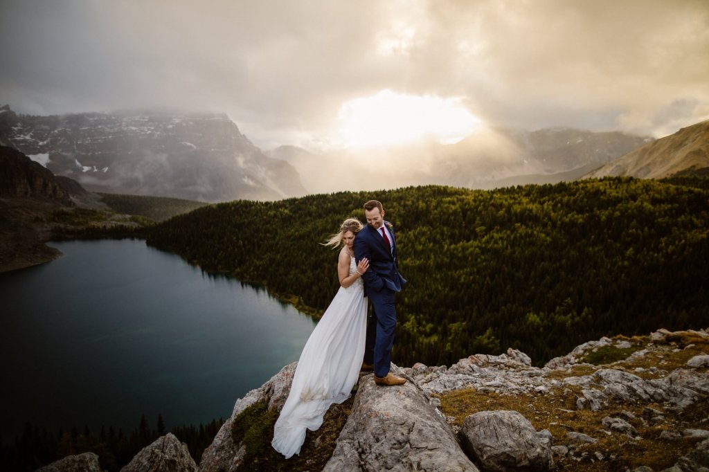 “The general weather forecast for this elopement in British Columbia was looking cloudy. However, diving deeper into the weather graphs we knew there was going to be a break in cloud coverage the first evening we were there. Using that information, we were able to pick the best time for their hiking elopement of the three days at Mt. Assiniboine Provincial Park. Sure enough, we had the most unreal sun rays break through the clouds mid-elopement that you can see in the photos!” [Afton]