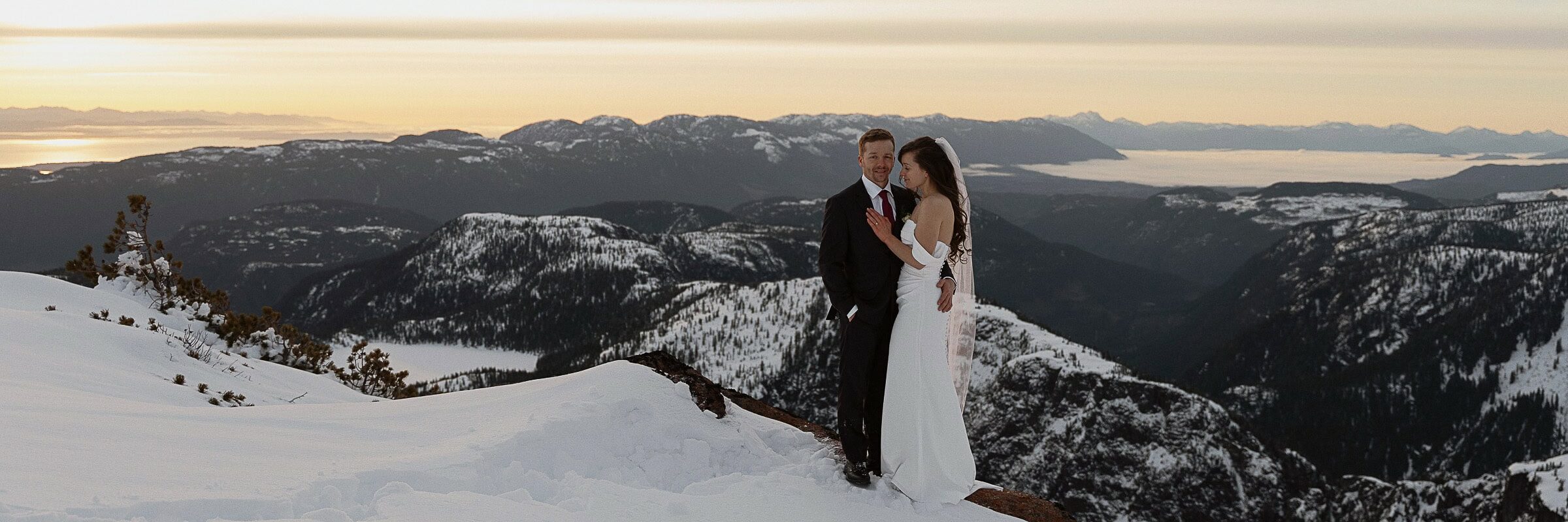 “We started the morning with a helicopter ride to a mountain top near the glacier. We were able to capture some stunning sunrise photos with an incredible view. The bride was an absolute trooper to brave the cold while we took photos. Her something borrowed was a blanket from her sister-in-law, which worked out perfectly. After we were finished on the mountain, I met the couple at the Comox Marina where we took their boat to get married on the water in front of Tree Island. It was very intimate with only the bride’s parents in attendance. The ceremony was tailored to the couple and there wasn’t a dry eye on the boat. It was so special. We stopped on Tree Island to take some more photos of the couple and her parents. A proper snow-to-surf elopement.” [Sarah, the photographer]
