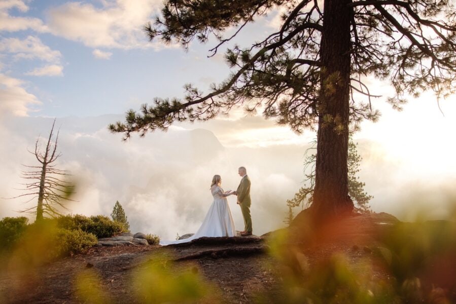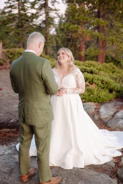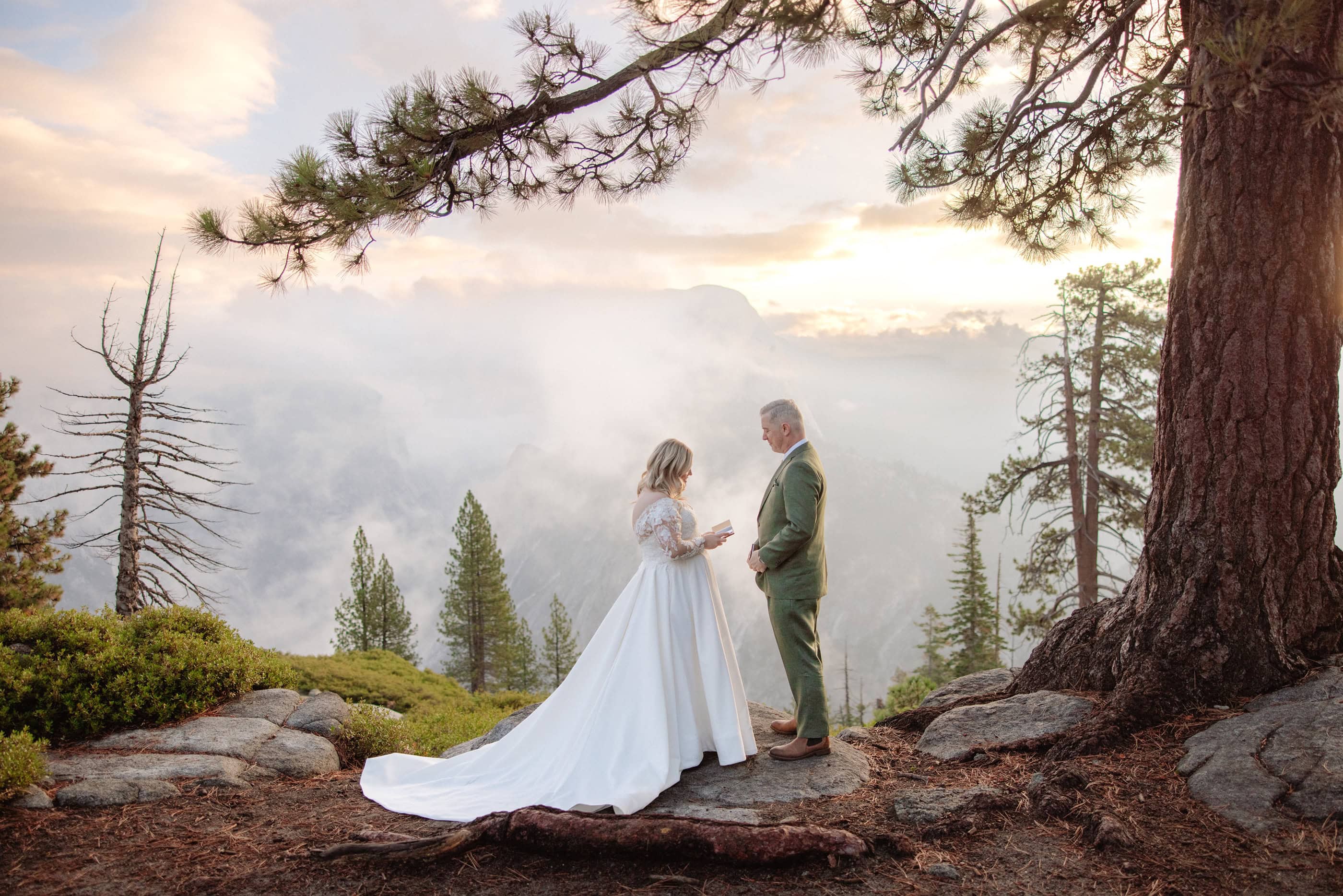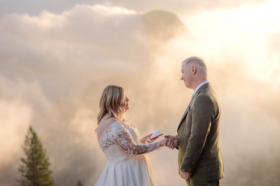 They intentionally chose a quiet area away from early visitors so the space would feel private. Amanda walked up behind Grant, tapped him on the shoulder, and as they turned toward one another, the sun began rising over the valley. Facing Half Dome, they opened their vow books.