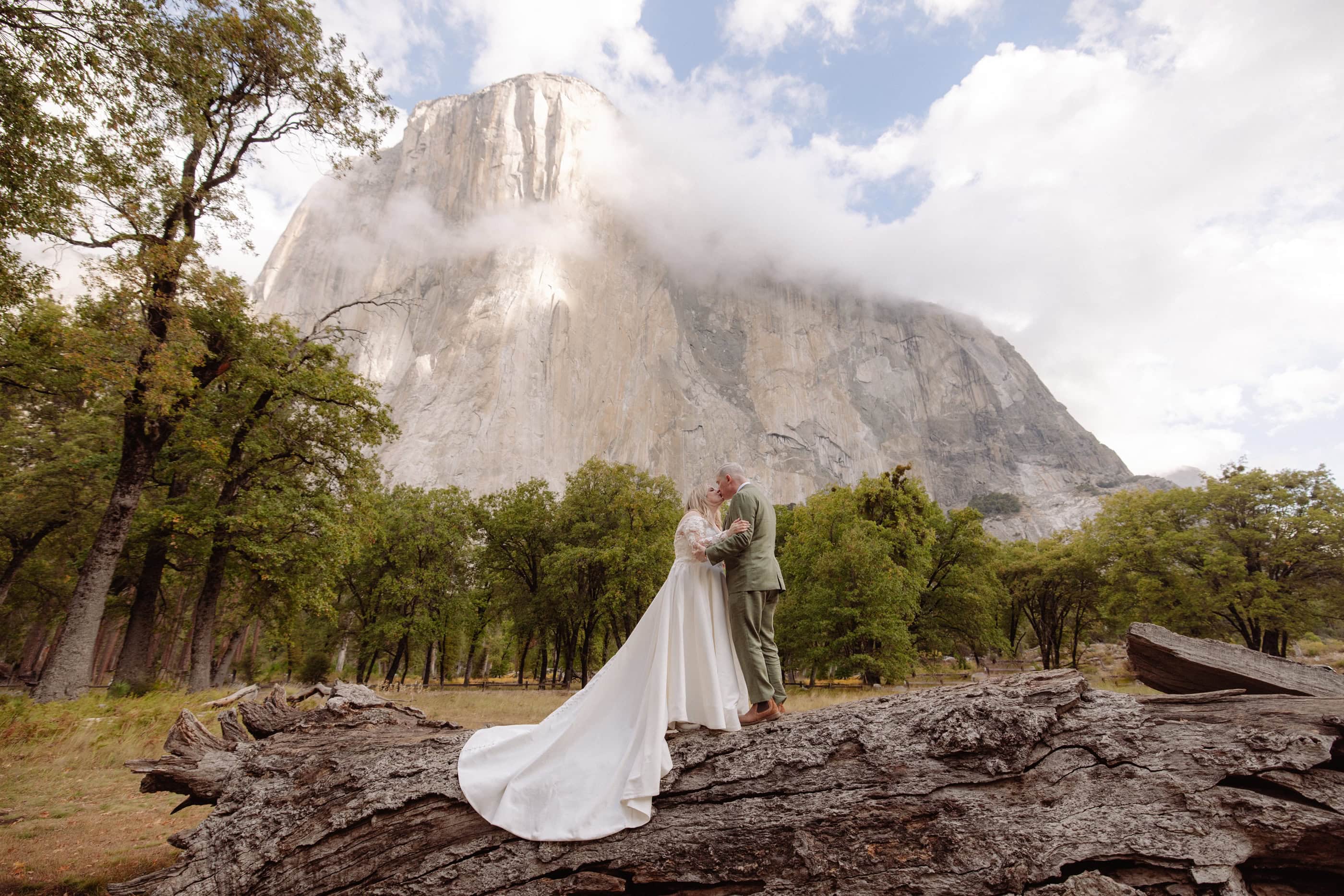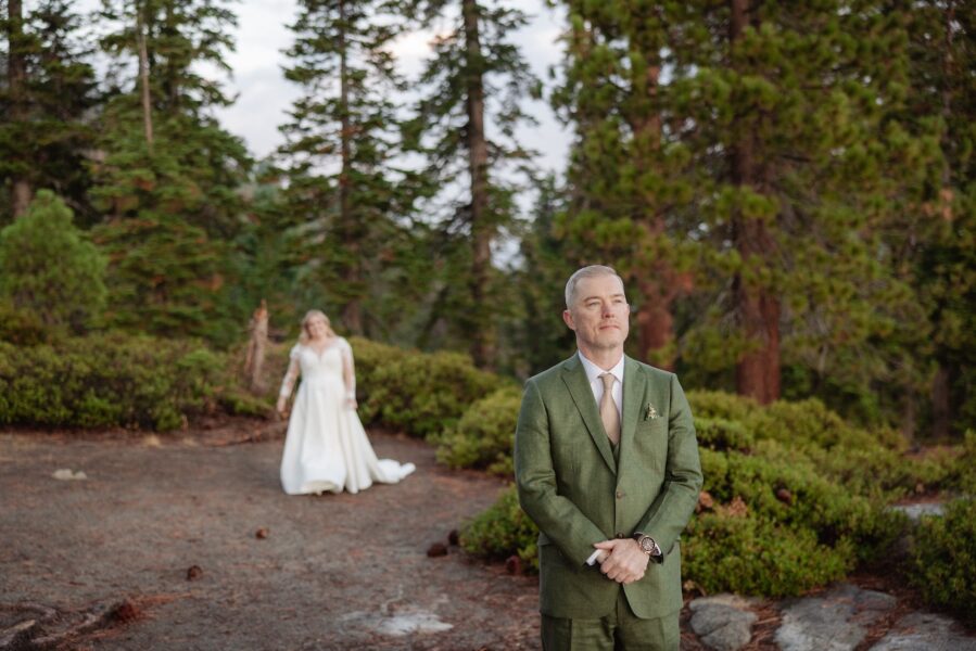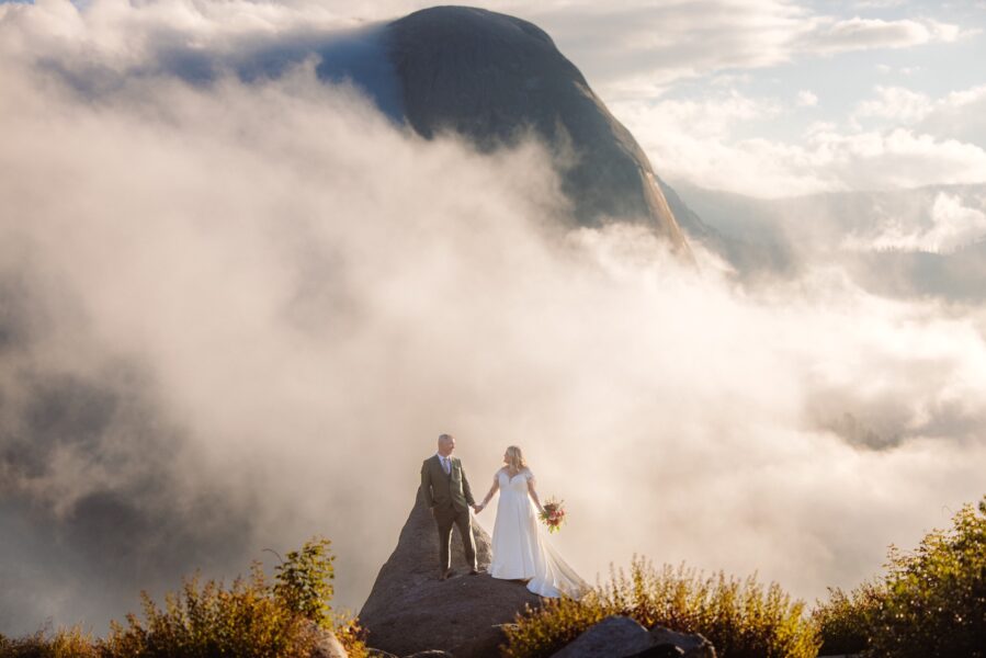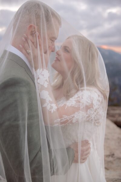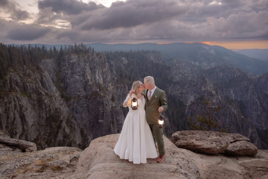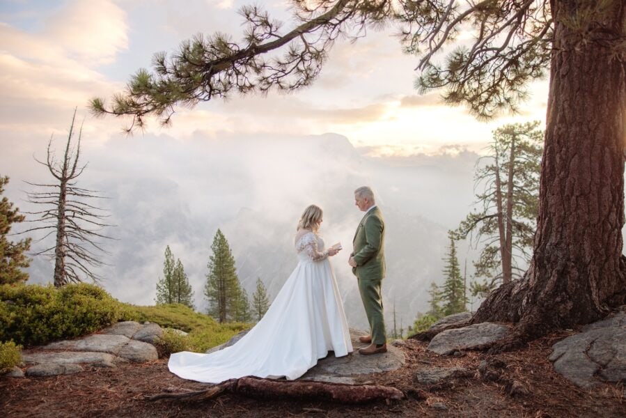 Amanda and Grant met Alyssa at Glacier Point just after 6:30 in the morning, stepping into a sky layered with clouds and soft early light. The air carried that early fall chill Alyssa had prepared them for, and before their first look, Amanda finished getting into her dress inside Alyssa’s pop up tent so she could step out ready for the moment they had imagined for months.