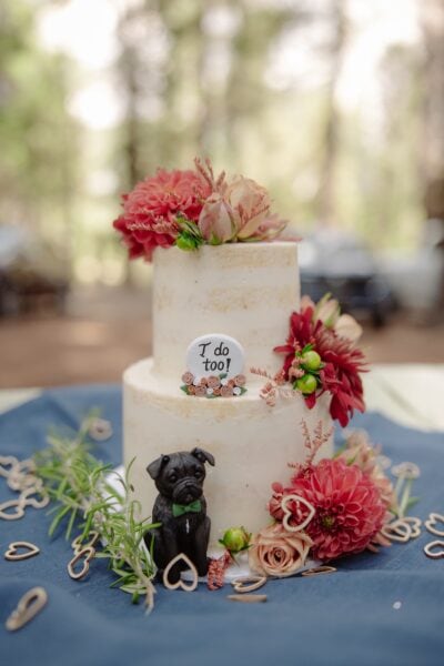Their small wedding cake was topped with a handmade figurine of their pug, Gilbert, complete with florals to match Amanda’s bouquet and a tie to match Grant’s green suit. They also gifted each family member a Stanley bottle in matching wedding colors, both as a keepsake and something practical to use during the picnic.