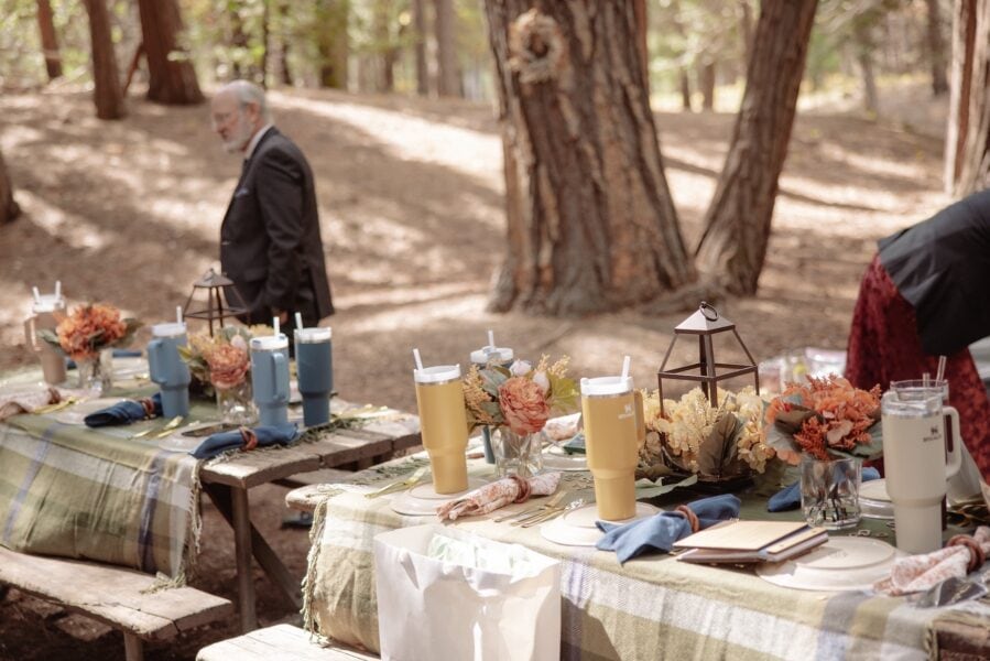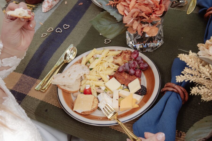 Instead of transitioning to a traditional reception, Amanda and Grant stayed at Cathedral Beach for a picnic beside the river. The tablescape featured soft fall tones in rust, pale pink, green, and navy, bringing subtle color into the natural setting.