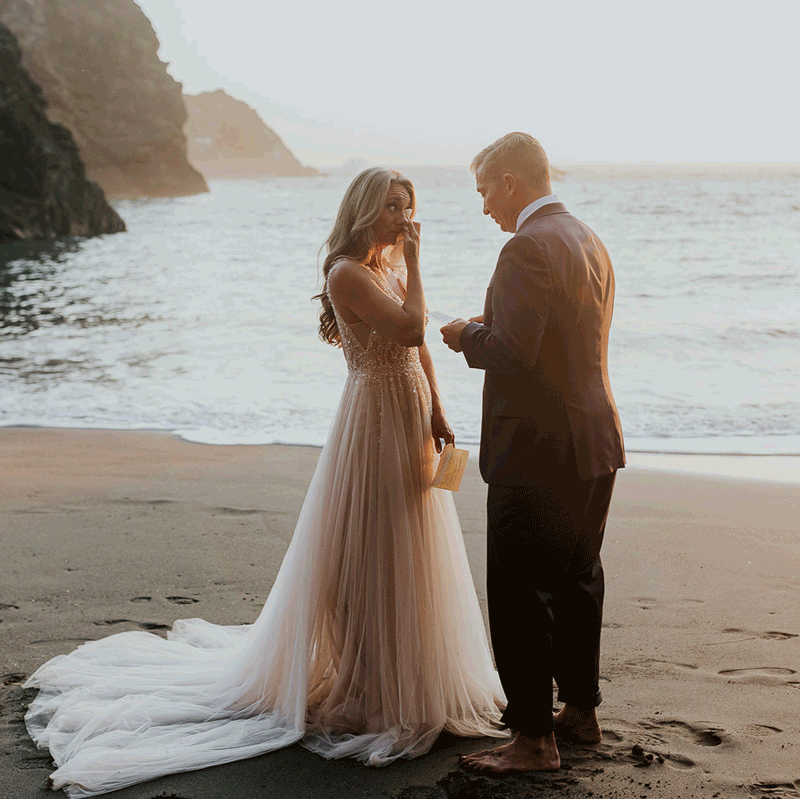 “Because we got up for sunrise, we were rewarded with the whole beach to ourselves. It was foggy, still, and secluded. We ran around and were awed by the rock formations. I absolutely loved that C+A took the time to sit down on the beach at sunset to read letters from their loved ones over a glass of wine. It was emotional, joyful, and special. It honored those close loved ones who couldn’t be there; a great way to include family if you want a ‘just us’ elopement experience.