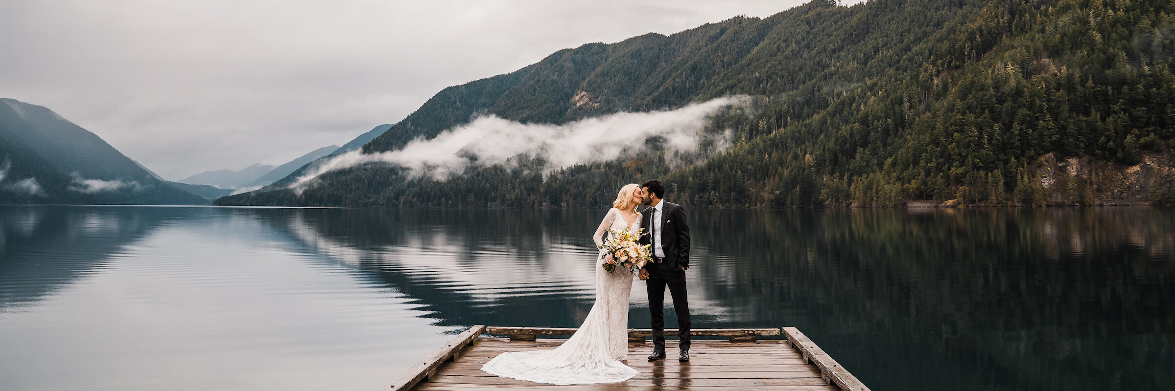 “We arrived at Lake Crescent to an incredible scene. Moody clouds hung low, reflecting on a perfectly glassy lake. I couldn’t believe that there wasn’t an ounce of wind or crazy weather! They strolled out to the end of the dock and set up Nyika’s flowers. Mountains surrounded them with clouds drifting in an out as they said vows.
