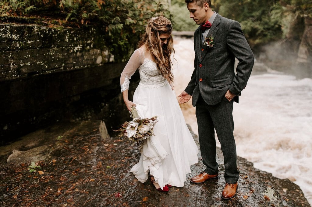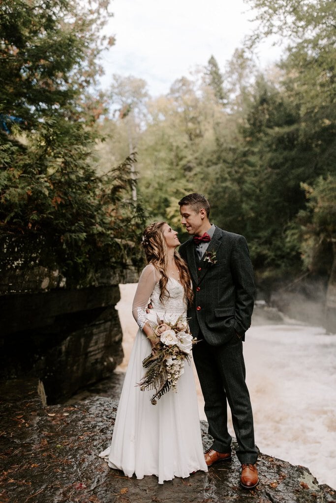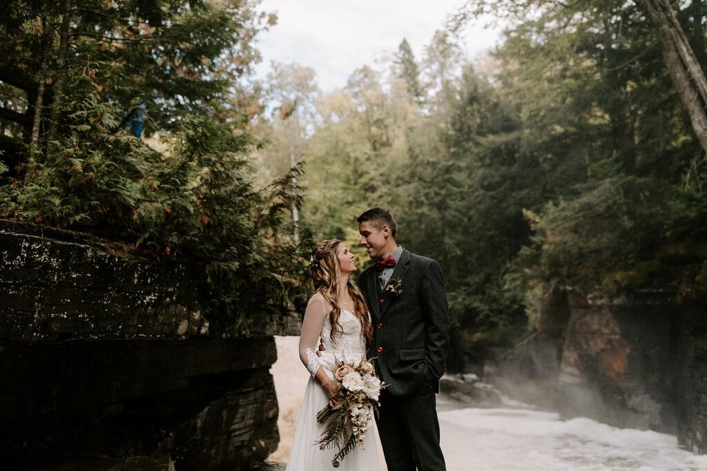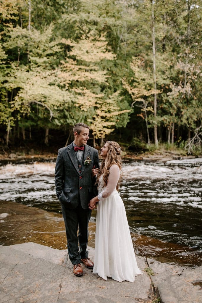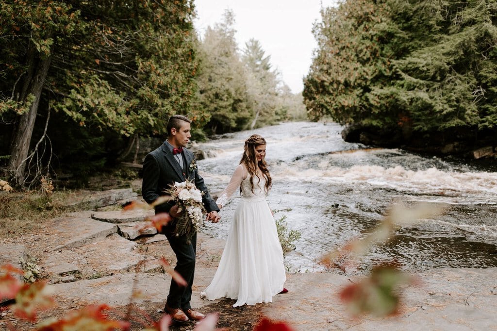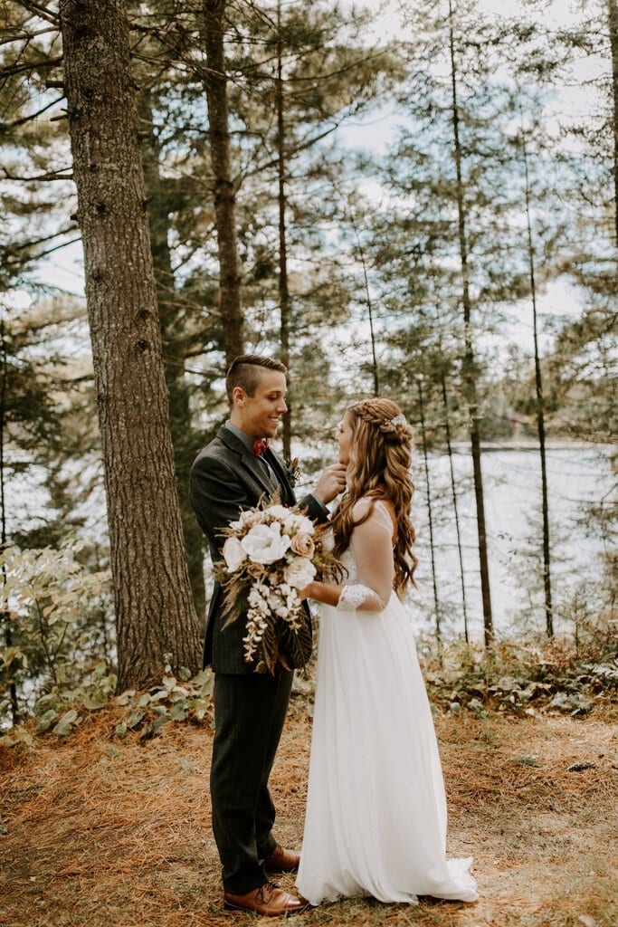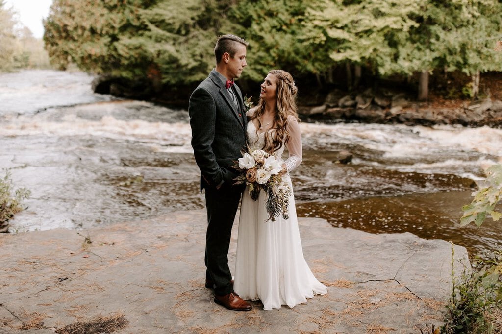 “As avid lovers of the outdoors, Christine and Derrick chose to celebrate their love with 50 of their closest friends and family in Michigan’s beautiful upper peninsula. They said their vows with a beautiful forest and waterfalls as their backdrop and then went to celebrate at a beautiful cabin along Juncob Lake. It was a day filled with so much love, laugher, beautiful hikes, and [an] amazing homemade wedding cake!”