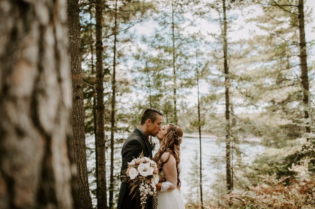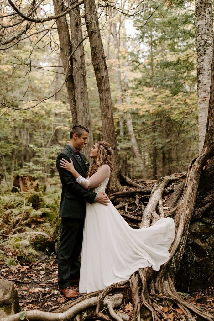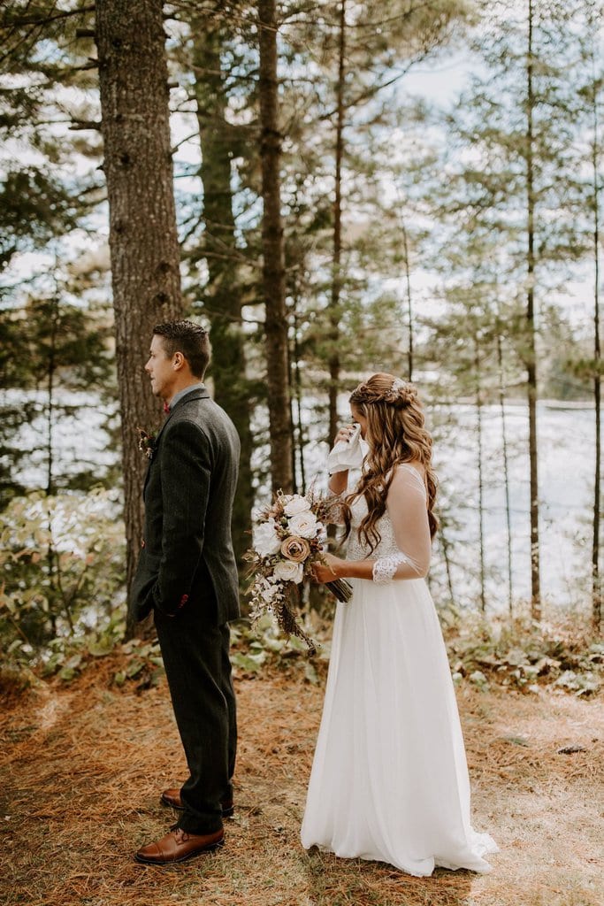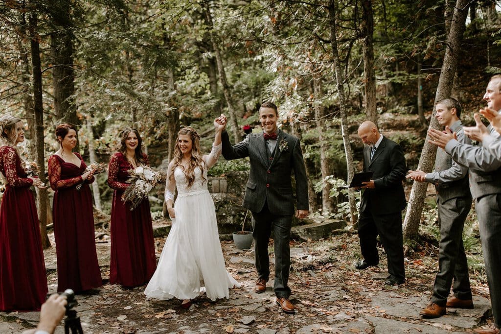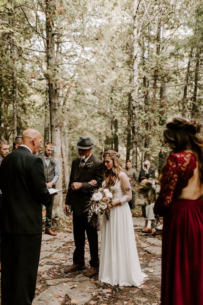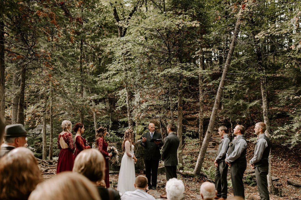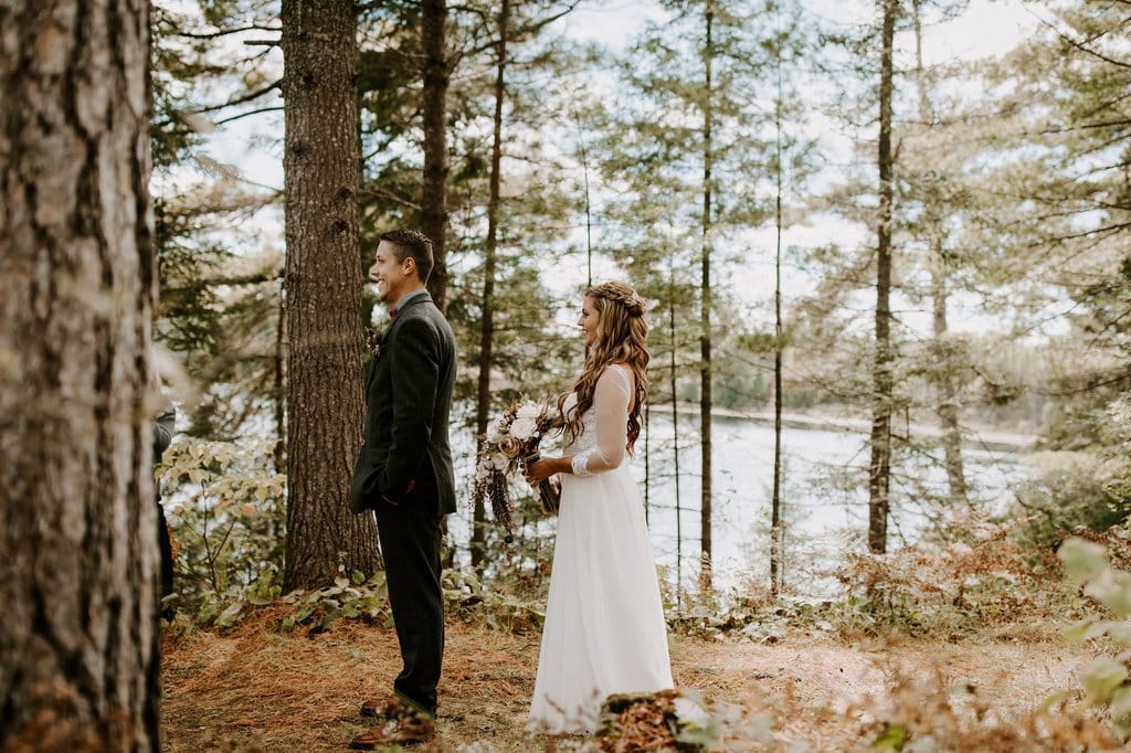 “As avid lovers of the outdoors, Christine and Derrick chose to celebrate their love with 50 of their closest friends and family in Michigan’s beautiful upper peninsula. They said their vows with a beautiful forest and waterfalls as their backdrop and then went to celebrate at a beautiful cabin along Juncob Lake. It was a day filled with so much love, laugher, beautiful hikes, and [an] amazing homemade wedding cake!”