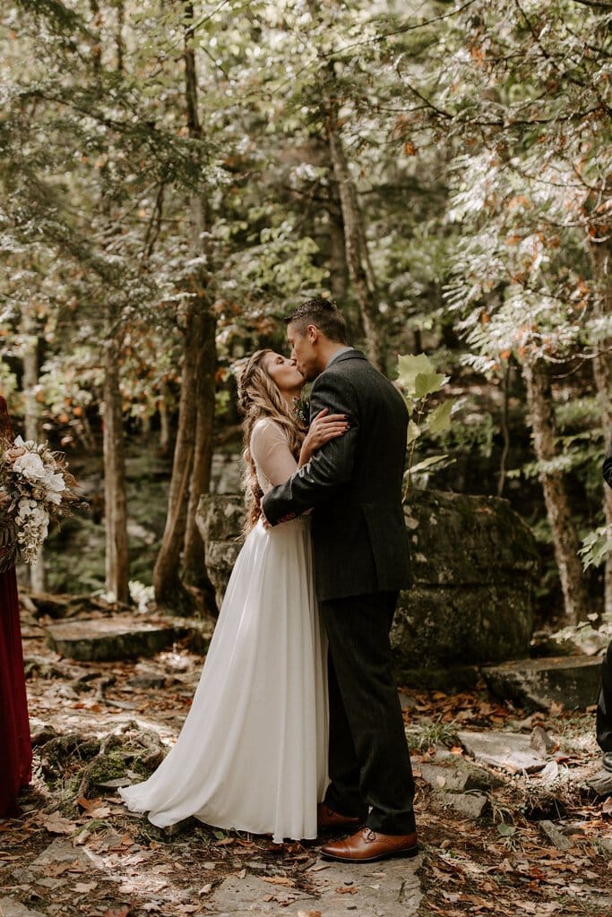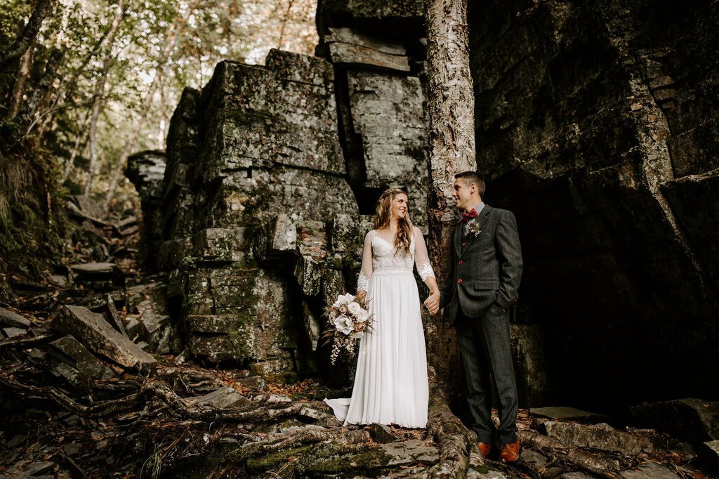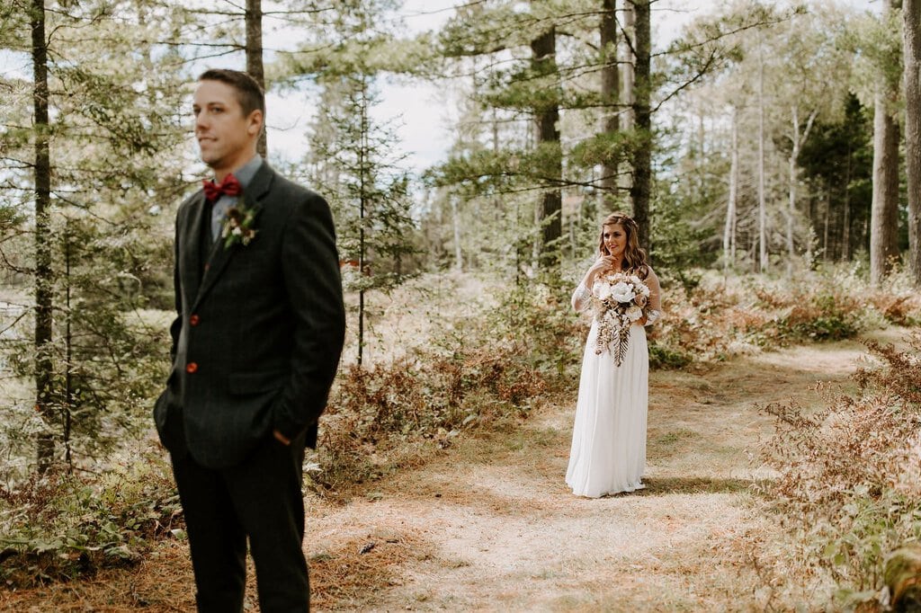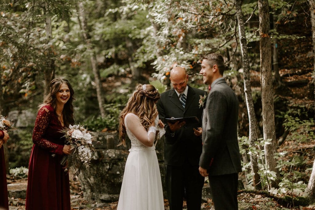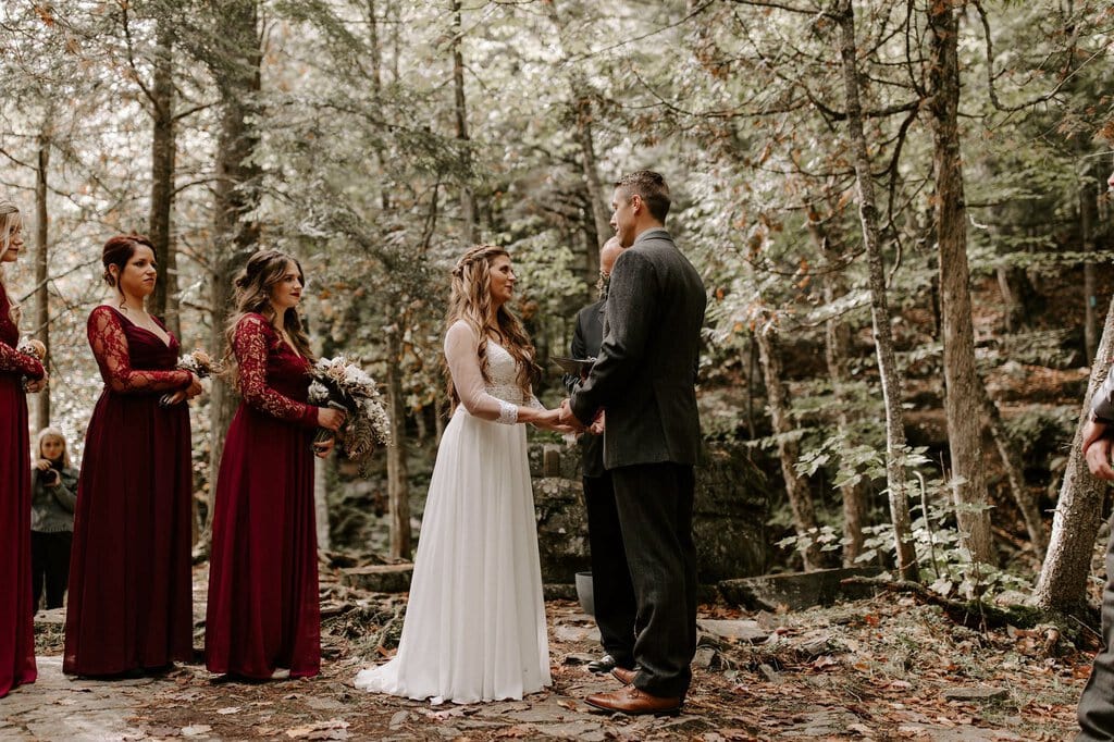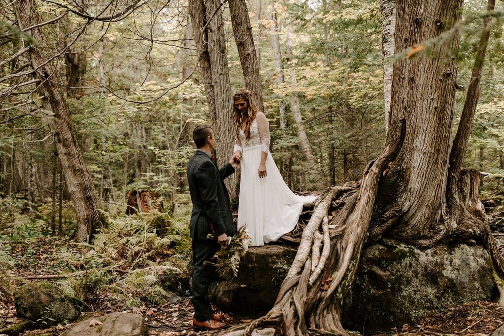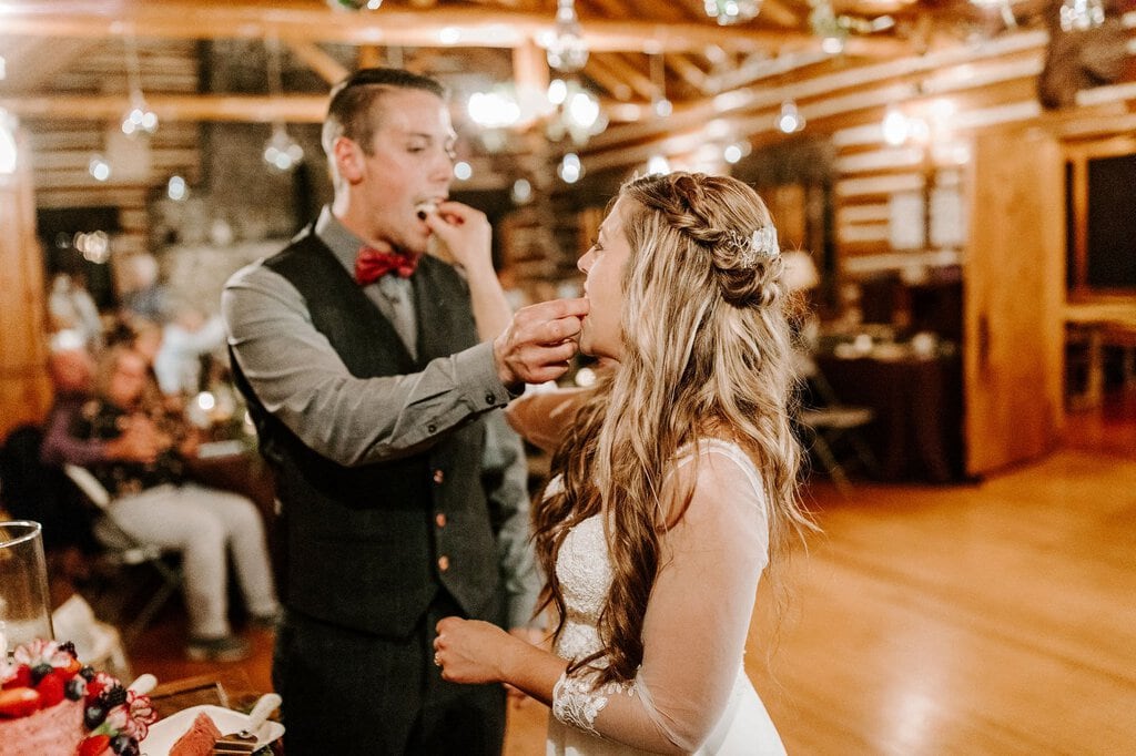 “As avid lovers of the outdoors, Christine and Derrick chose to celebrate their love with 50 of their closest friends and family in Michigan’s beautiful upper peninsula. They said their vows with a beautiful forest and waterfalls as their backdrop and then went to celebrate at a beautiful cabin along Juncob Lake. It was a day filled with so much love, laugher, beautiful hikes, and [an] amazing homemade wedding cake!”