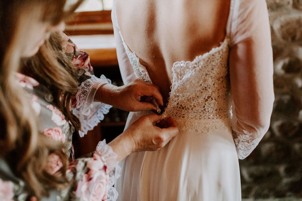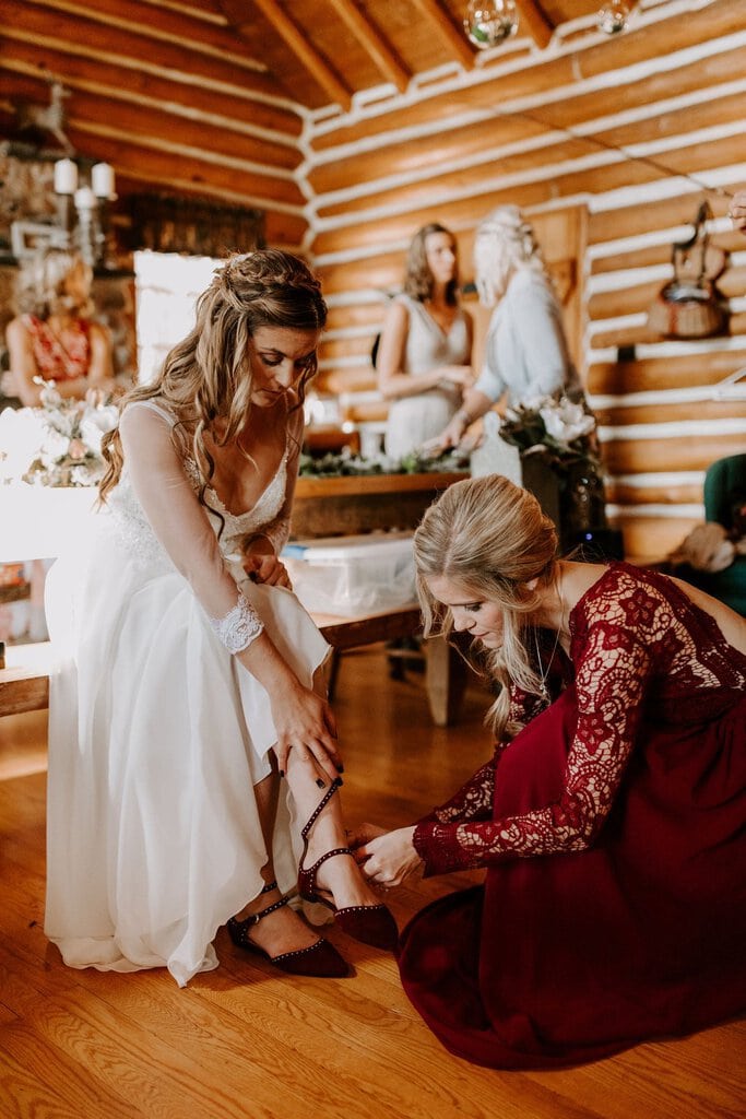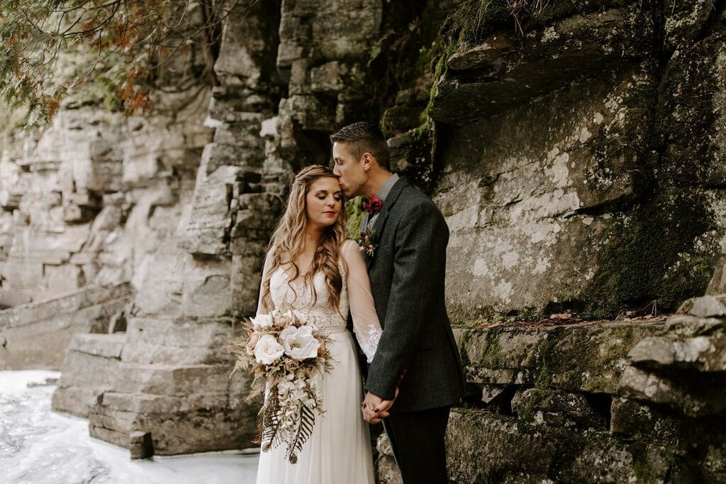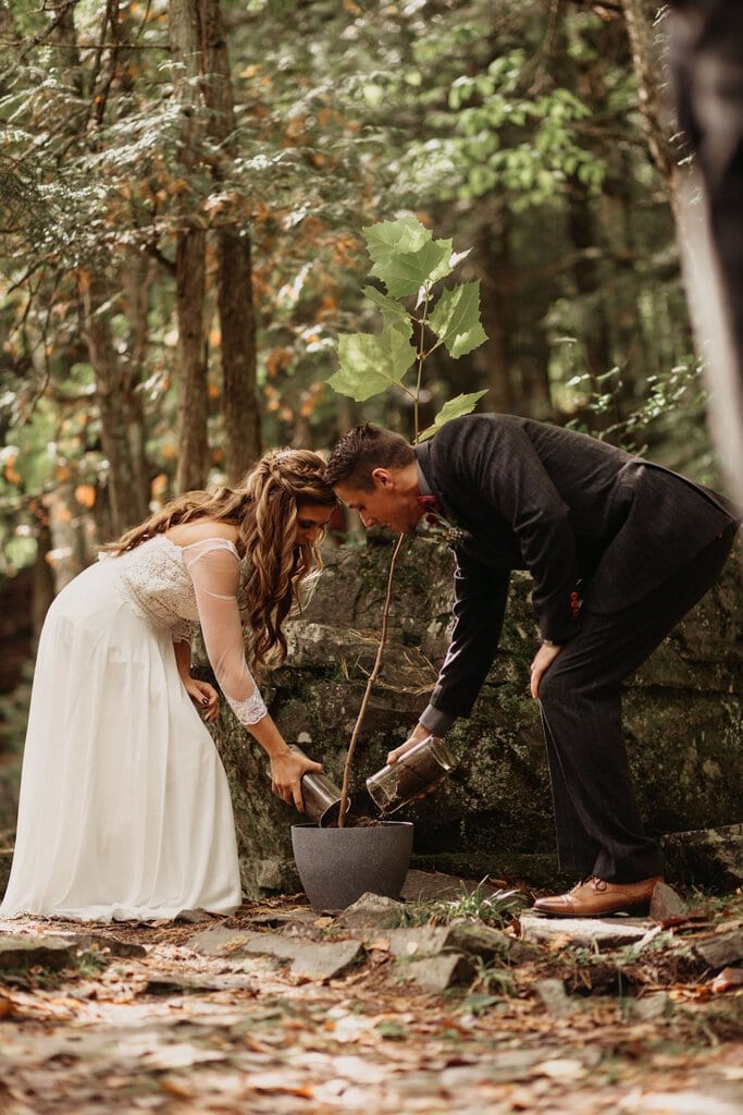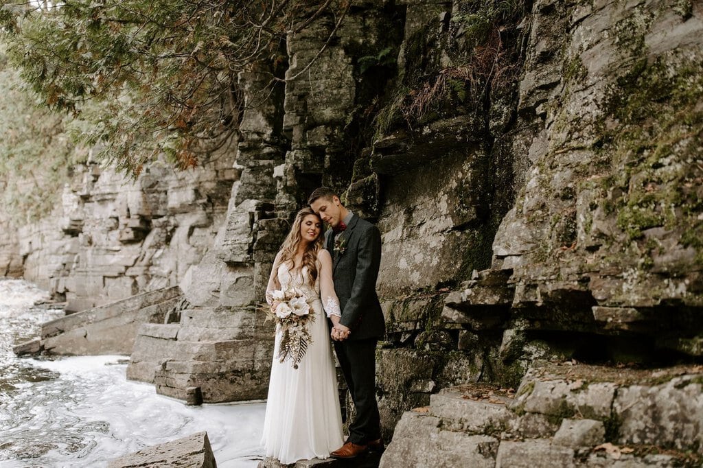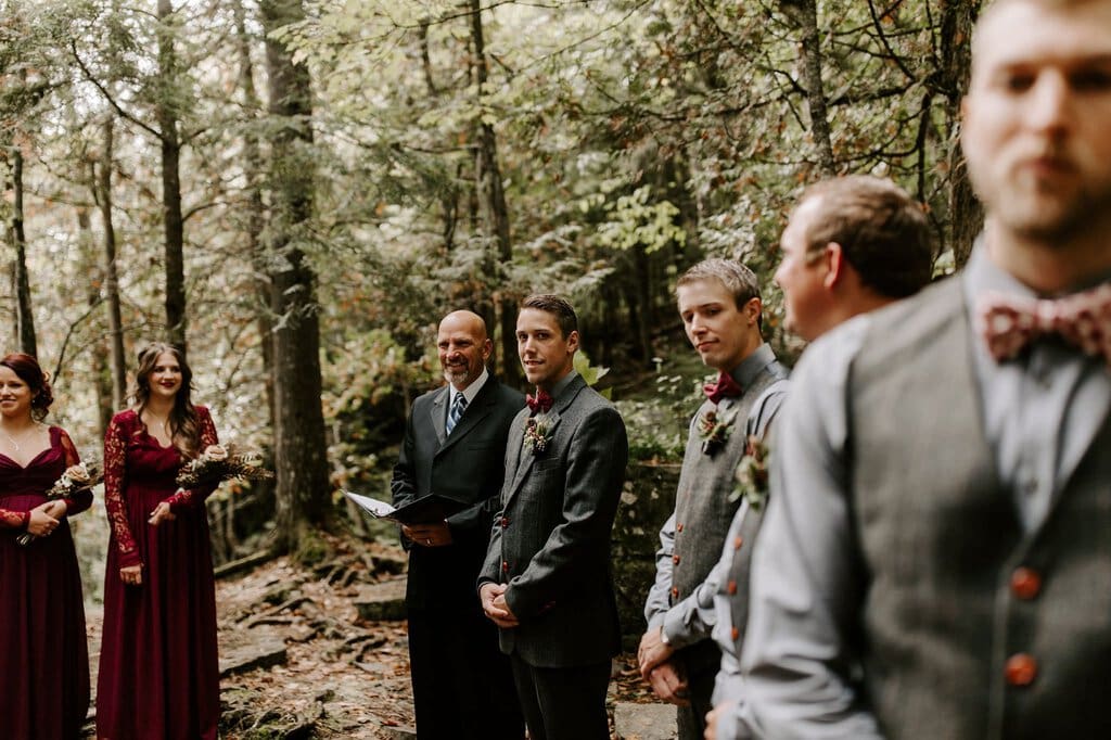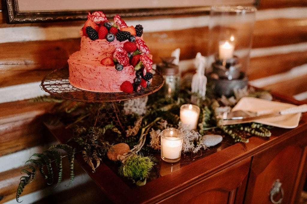 “As avid lovers of the outdoors, Christine and Derrick chose to celebrate their love with 50 of their closest friends and family in Michigan’s beautiful upper peninsula. They said their vows with a beautiful forest and waterfalls as their backdrop and then went to celebrate at a beautiful cabin along Juncob Lake. It was a day filled with so much love, laugher, beautiful hikes, and [an] amazing homemade wedding cake!”